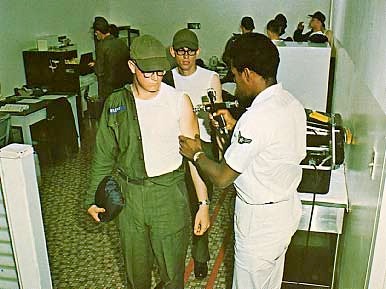 The men giving the shots talked to each other constantly, and did not look at what they were doing. The gun made a little fweeping noise to punctuate their chatter, “…and so we went to the La Pasa Drive-In (fweep) and opened some beer (fweep) and things were just going right (fweep) when she said…” and so on. I found the best thing was to step up quickly, hold very still and then move away quickly. Those who waited to be excused got the same shot again. They usually moved after that. Our flight of 50 men passed through the shot line in about 90 seconds. The highest fever came from plague and flu shots together; it was 90 degrees that afternoon and none of us felt too good.