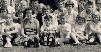From the group photo in 1956, me with the cuffed jeans, framed by Linda Stark in her square dance skirt and Mickey Stark flexing.