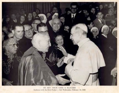 Below, a photo of Father Klauder with Pope Pius XII, February 1958.