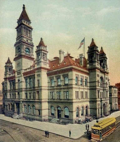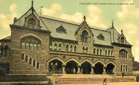 The French chateau post office of Evansville, Indiana, designed by William A. Potter and built in 1879, with buff limestone walls, brown sandstone trim, slate roofing and granite columns.