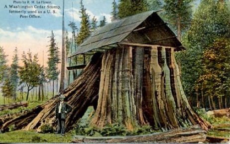 The gigantic cedar stump in Port Angeles, Washington, that served as a post office until 1905, with William McDonald, Postmaster.