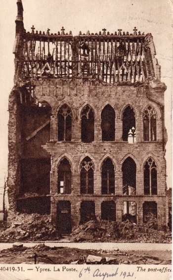 Ypres was an historic medieval town in Belgium that was “strategically placed” during World War I. Three battles were fought there; the German army started the second battle in April of 1915, but when they couldn’t take the town, they chose to demolish it with artillery. Their guns included a 17-inch howitzer firing shells of 1,719 pounds. It was said they came in “with a noise like a runaway tramcar on badly laid rails.” The gun was the legendary Big Bertha, made by Krupp and named for the heiress who inherited the firm in 1902. The post office in Ypres, shown in a postcard mailed to Yorkshire in 1921, was on the receiving end of the punishment.