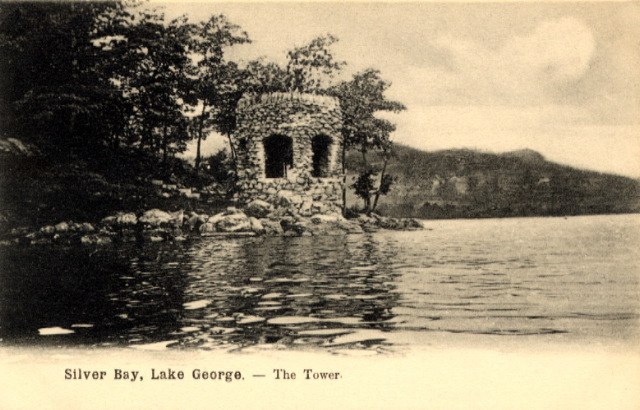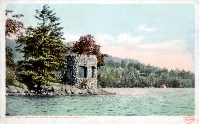 Because Silas Paine was an executive with Standard Oil, working for John D. Rockefeller, this was no pipe dream. Starting in 1892, Silas Paine did buy Silver Bay, including Judge Wilson’s hotel, and most of the next bay over — known as Van Buren’s Bay then and Oneita Bay today — and he built what is now Paine Hall, with cottages, outbuildings and gardens. The stone tower went up some time around 1896.