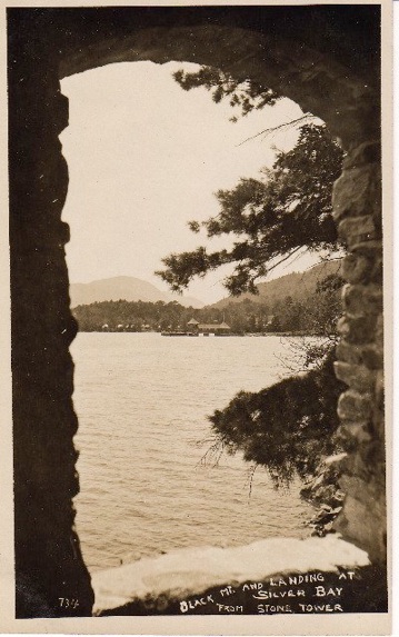 Above, a real photo postcard, the photo taken from inside the Stone Tower through an arched window, by J.S. Wooley. The caption reads, “Black Mt. and Landing at Silver Bay from Stone Tower.” The Landing, of course, is where the steamboats docked; today it is the ERC (Employee Recreation Center). It can be seen across the water, in the center.