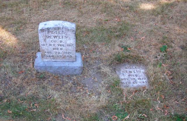 In 1860, Peter DeWein was a 16-year-old apprentice tinsmith, living with another family and learning a trade. On September 5, 1864, at the age of 20, Peter DeWein enlisted as a private in New York’s 187th Volunteer Infantry. On October 11th, he was promoted to the rank of Full Sergeant, and four days later he left Buffalo for Petersburg, Virginia. He was attached to the 2nd Brigade, 1st Division, 5th Army Corps, Army of the Potomac. Ten days after he left Buffalo he was under fire. He survived six battles and was “mustered out” in Arlington Heights, Virginia, on July 1, 1865.