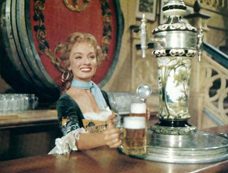 Another wine-drinking noble is The Student Prince (1954), whose elders feel he could use a little loosening up. Indeed, Prince Karl (Edmund Purdom) exhibits all the charm of a frosty suppository. So he is packed off to Heidelberg to mingle with his inferiors and lap up big frosties of another kind. This is a Hollywood Heidelberg, so the results are immediate. After draining one tall stein, he takes the lead in singing “Drink, Drink, Drink” (with the voice of Mario Lanza!) and falls in love with Kathie the barmaid (Ann Blyth, shown above) who teaches him to eat kraut and knockwurst. What a transformation. Sadly, it’s only temporary; the royal whelp abandons the barmaid for the good of his kingdom and returns to wine. But we are asked to believe that his fling with lager imbued him with at least a splash of humanity.
