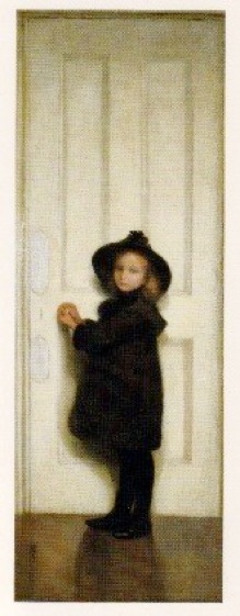 A girl in a dark hat and coat stood at a white door, about to turn the knob. Not the stuff of epic romance, but I couldn’t leave it. It cast a spell and I was caught. When I did manage to leave, I came back again. I don’t remember anything else in the room. The painting was titled The Little Girl at the Door, and the artist was Harriet Halhed (1851-1933). She was born in Australia, but came to England and studied in Canterbury at the Sidney Cooper School of Art, at the Royal College of Art in London, and then in Paris under Louis Henri Deschamps. She returned to Canterbury where she painted, taught, and occasionally did sketches of sculptural details at the Canterbury Cathedral for the Kent Archeological Society.