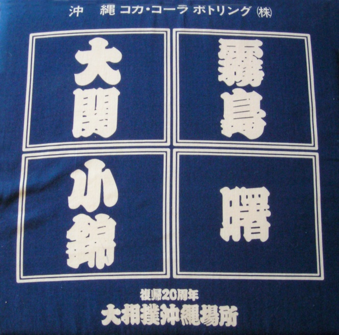 Ralph’s zabuton came with a translation, for which I was grateful. The top line was from the sponsor: “Okinawa Coca-Cola Bottling Co.” The four center symbols, clockwise from the top right were “Ozeki” (champion), “Kirishima,” “Akebono,” “Konishiki,” i.e. the rank and names of the three top stars of the day’s basho. The two bottom lines noted that this tournament, in 1992, was the 20th in Okinawa.