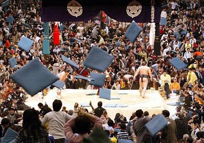 Sumo seat cushions are given to those in the good seats, for comfort, and are occasionally put into service in another role: After a particularly good match, they are thrown into the air to express the crowd’s approval and excitement. After a bad match, they may be thrown into the ring to express the opposite.