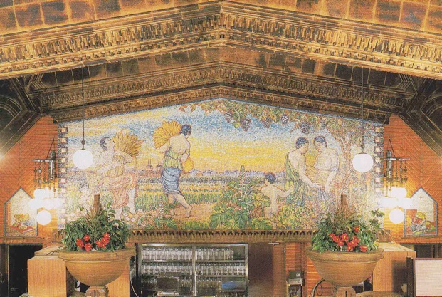 In the style of a German beer hall, the main floor of the Lion is a single large room with high, arched ceilings, broad pillars and peaked rafters. The pillars and ceiling are tiled in green and brown, and small mosaics are set in alcoves along the side walls. The heart of the Lion is a vast mural that dominates the far end of the room. It depicts women in togas, draped and undraped, out in the fields gathering sheaves of grain. The sun glows on the horizon and a lush grape arbor frames the scene. It is quite spectacular.