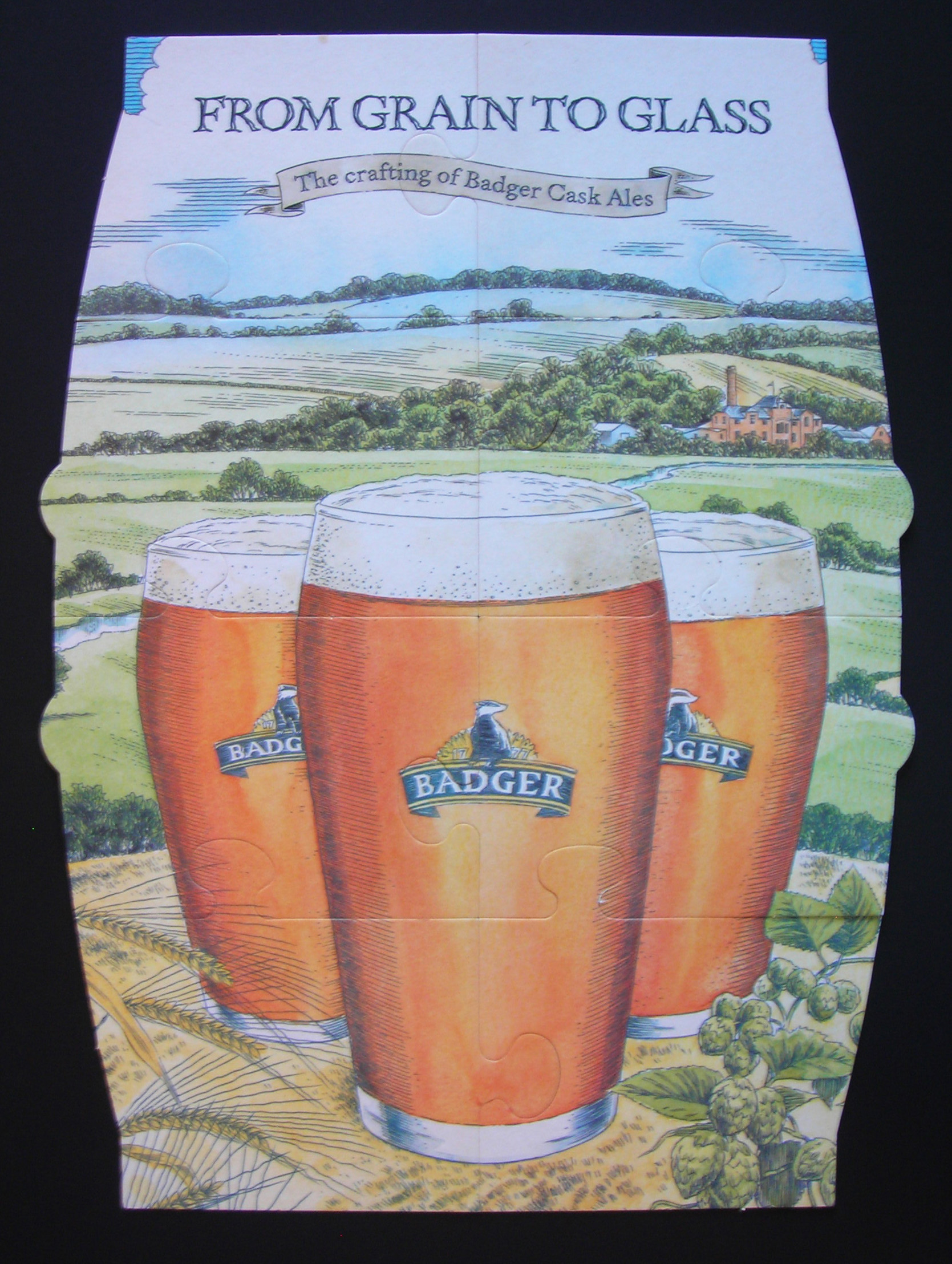 A few years ago, my sister-in-law Lee and her daughter, my niece Allyson, found themselves in The St. Stephen’s Tavern in London. You can see Big Ben out the window, and a bell rings two minutes before a vote so member of Parliament can dash back to be counted. At the time, Hall and Woodhouse, who own the pub and brew its beers, were producing a series of eight beer mats that could be pieced together like a jigsaw puzzle. Knowing my love of beer, Lee and Allyson were kind enough to begin roving from table to table to see if they could collect the whole set; the other patrons got into the spirit of the venture, and before long, the appropriate pieces of the puzzle had been assembled. They found their way to me and I finally found a frame large enough to do them justice. My thanks go out to St. Stephen’s, Hall and Woodhouse, and my saintly in-laws.