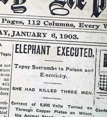Topsy spent the last years of her life at Coney Island’s Luna Park. Because she had killed three men – one being a trainer who fed her a lit cigarette – Topsy was deemed threatening. When it became known she was to be put down, inventor Thomas Edison lobbied for the use of his competitor’s Alternating Current (AC) for the task. Edison at the time was heavily invested in Direct Current (DC) and wanted to show Westinghouse’s AC was lethal. He actually knew AC was the better alternative, but business was business, and he was a reptile. On January 4, 1903, at the age of 28, Topsy was fed carrots laced with cyanide, then 6,600-volts surged through her body. She was dead in seconds. A crowd of 1,500 watched her die; lest anyone miss the scene, Edison filmed it to be seen by audiences all over the United States.