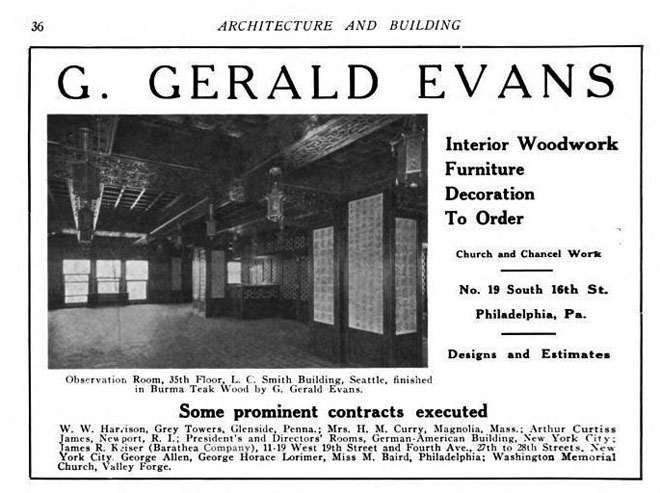 Chinese Room Evans Ad 1914The walls, doors, ceilings and furniture of the Chinese Room were hand-carved in Burmese teak by G. Gerald Evans of Philadelphia. Evans and his craftsmen could, and did, duplicate any style of woodwork. Evans did furnishings for DAR Memorial Hall in Washington, D.C., patterned after a room in the City of London and made of oak from the 1777 wreck of the British warship Augusta. Evans did ornate wood carving for the Washington Memorial Chapel at Valley Forge, and pews and pulpits for churches all over America.