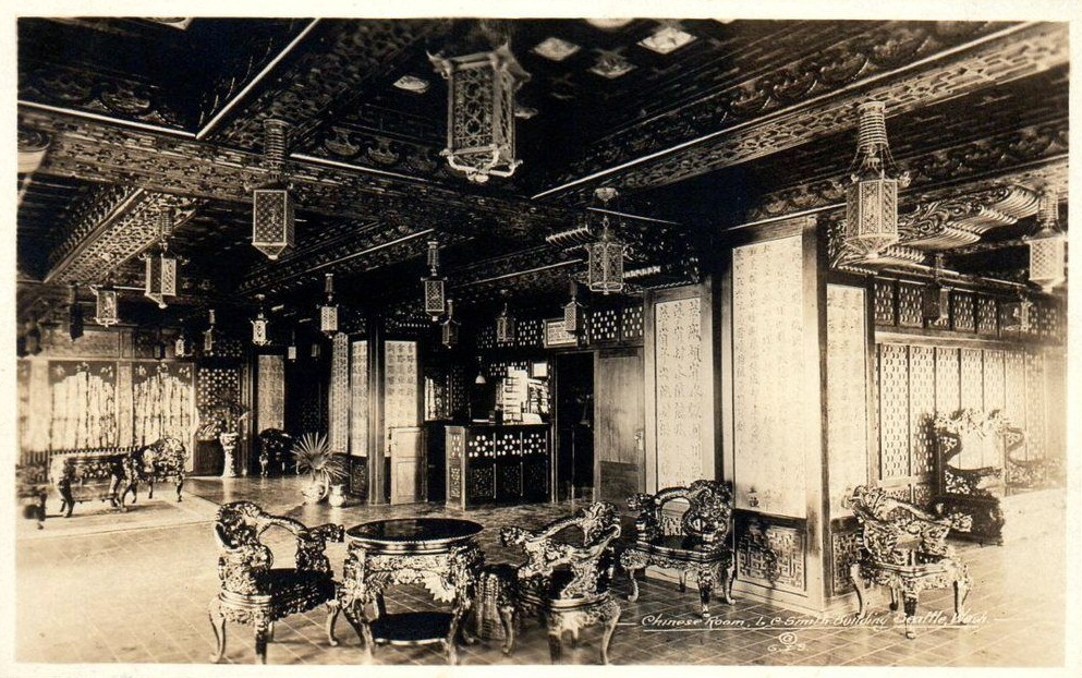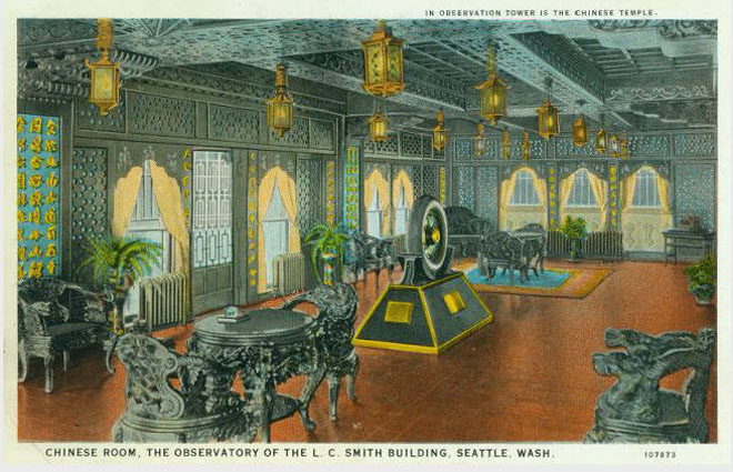 Smith Tower 1912The L.C. Smith Building was completed in the summer of 1914, and its opening saw a rush to the 35th floor, where an observation deck gave the people of Seattle spectacular views of the city, waterfront and mountains. Visitors were also charmed by the 35th floor’s Chinese Room.