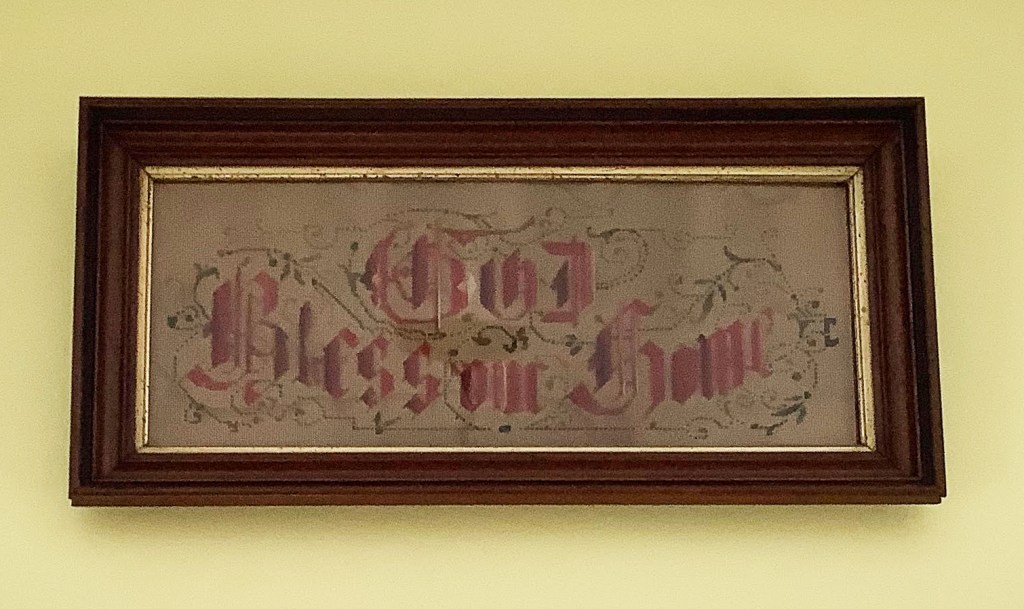 Abbie had a lovely, framed cross-stitch that said, “God Bless Our Home.” But Grandpa didn’t like it; he made her take it down and keep it in a closet. When Abbie came home from his funeral, she hung up her coat, leaned over, brought out the cross-stitch and hung it back up.